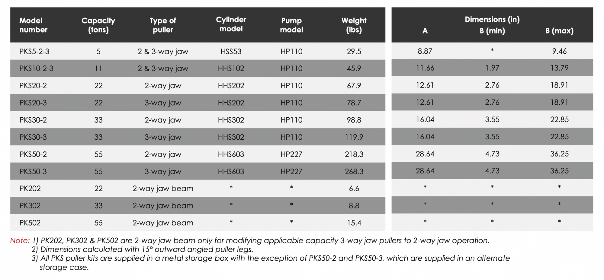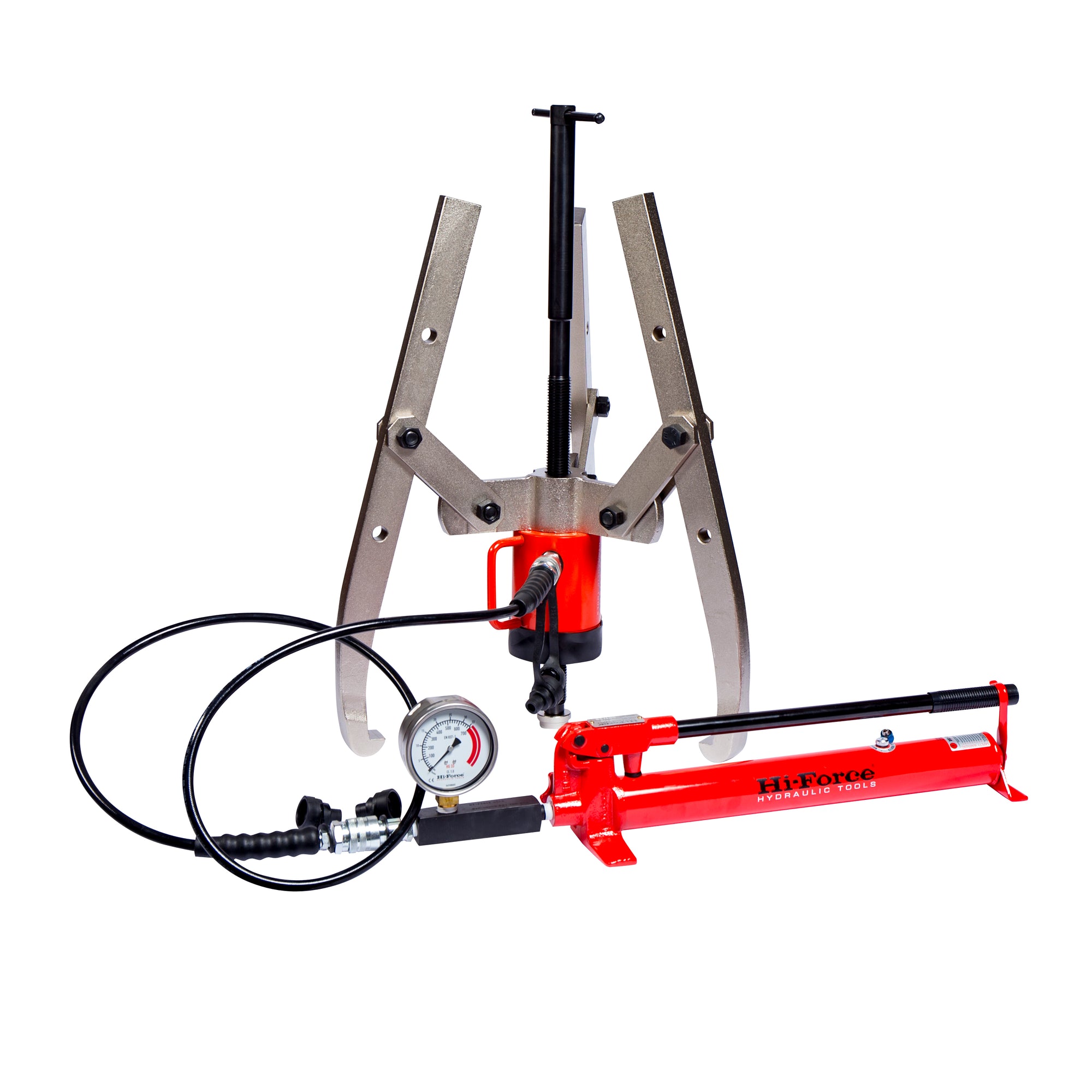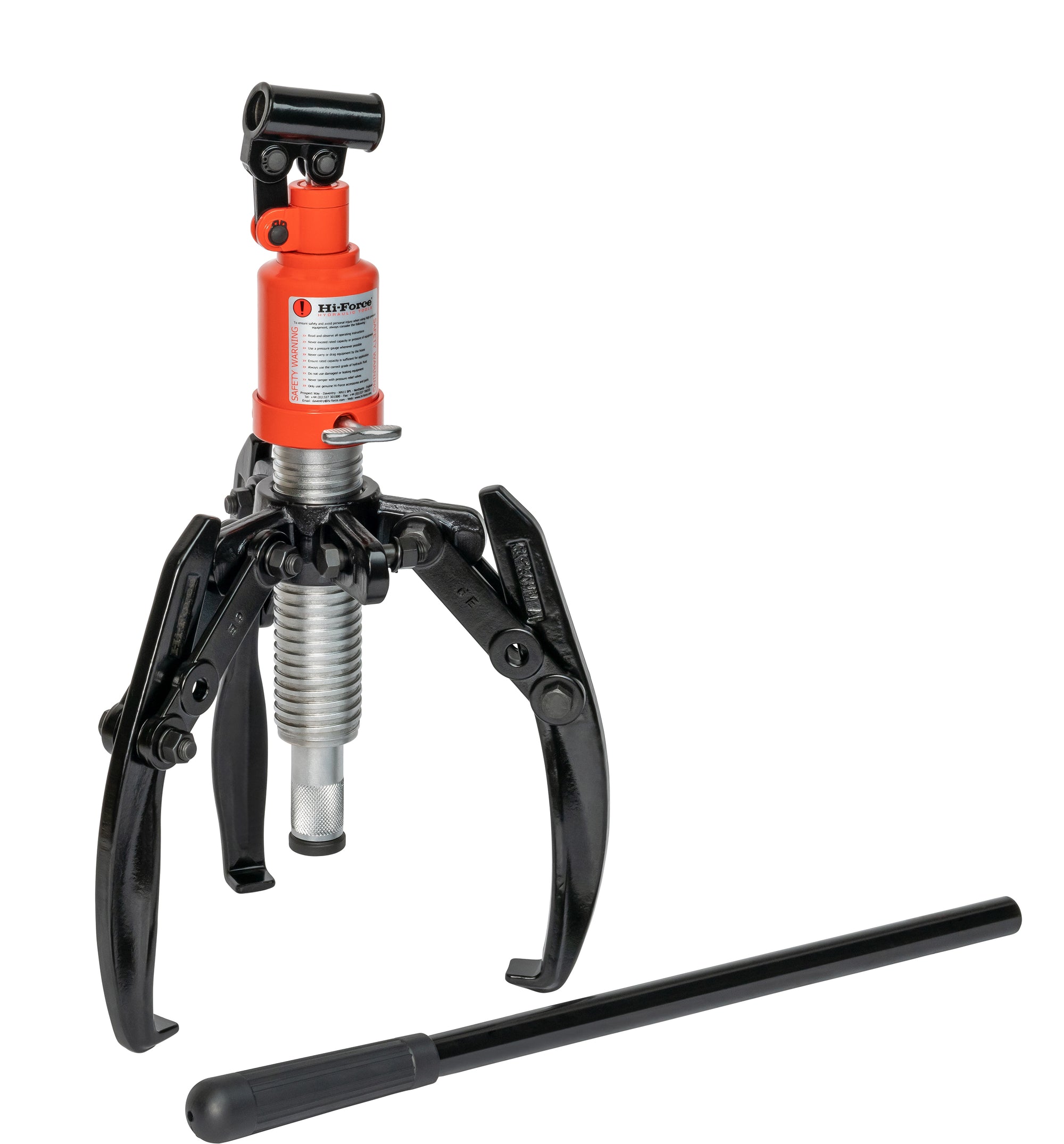 Self-contained and remote operation, manually operated, 2- and 3-way jaw-type pullers, bearing cup and cross head pullers, with pulling capacities up to 50 tons.