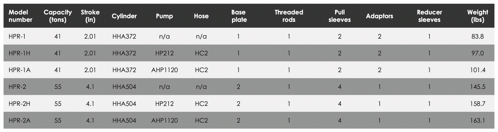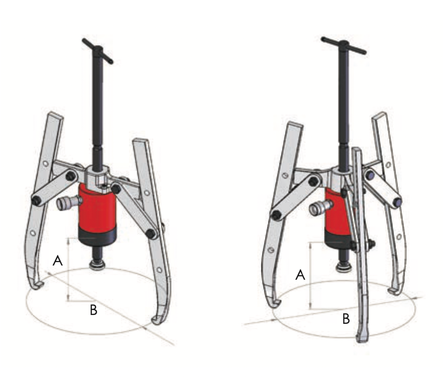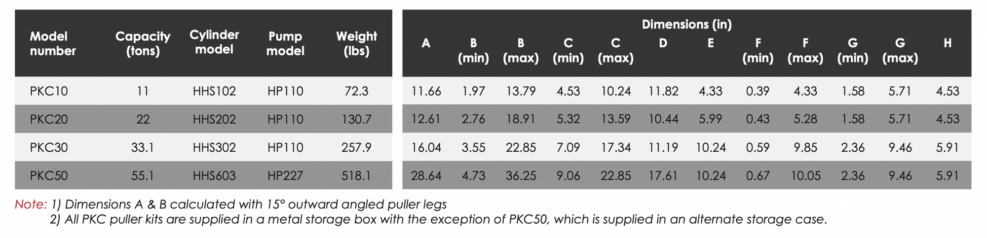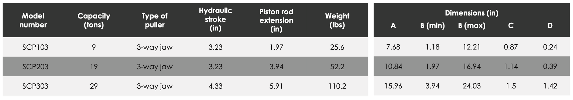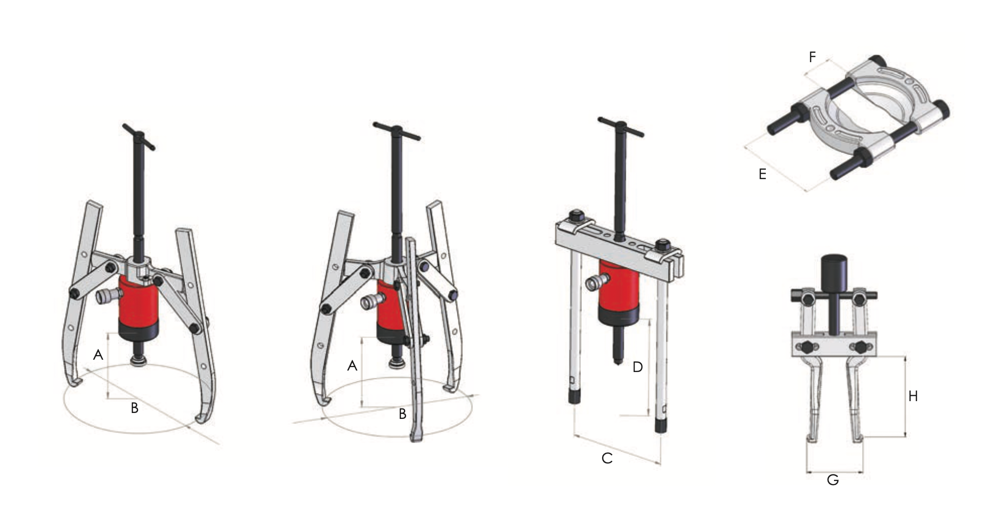 Self-contained and remote operation, manually operated, 2- and 3-way jaw-type pullers, bearing cup and cross head pullers, with pulling capacities up to 50 tons.