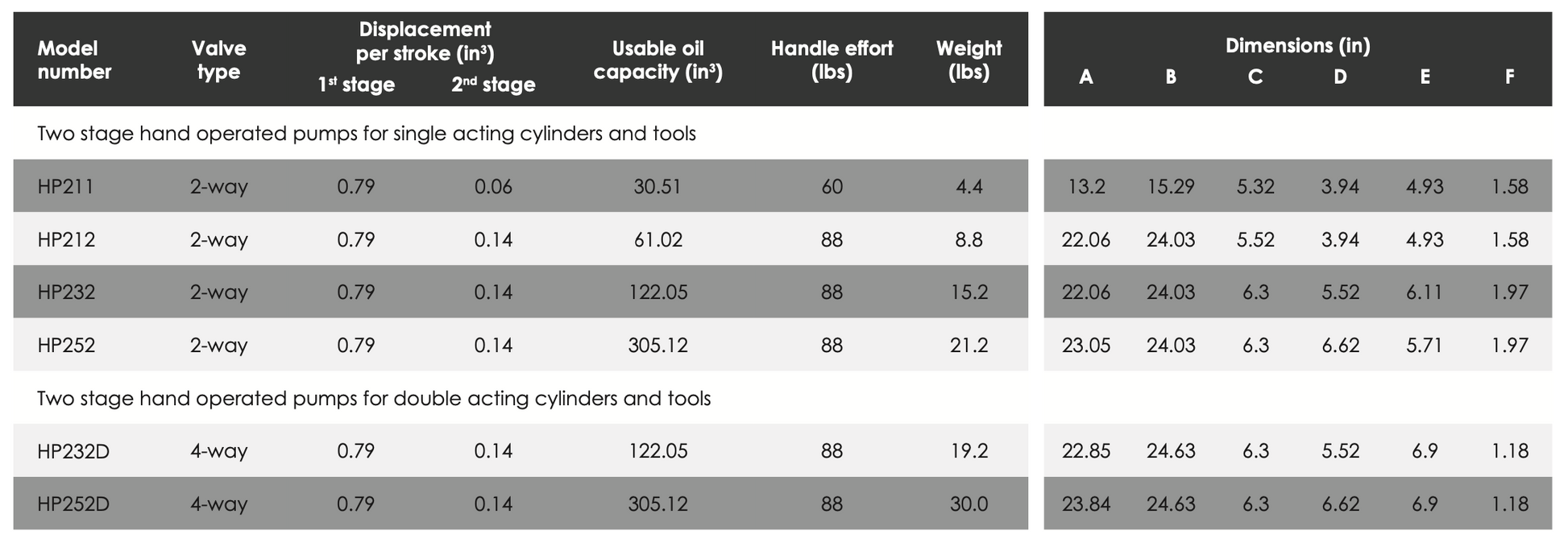 Oil reservoir capacity up to 305.12 cubic inches. Lightweight aluminum construction with external pressure release valve and factory set safety relief valve. Changeover pressure is 203 psi. Low handle effort and ergonomic grip for easy operation.