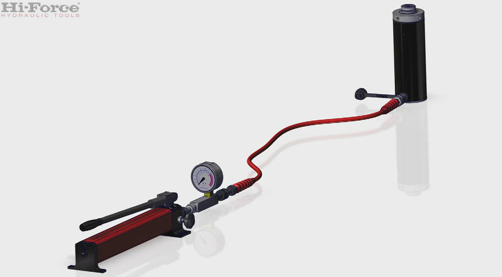 Choice of 18 models of pump, cylinder, and hose sets. Single acting, spring assisted return cylinders with solid or hollow pistons. Manually operated pumps with factory set safety relief valve. Standard 6.5 feet length hose with quick connect coupler. Optional piston rod saddles available for most models.